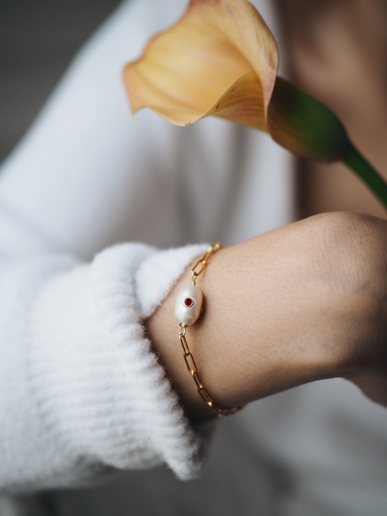 Crafted from 925 sterling silver with gold plating. Handmade design featuring a baroque pearl accented with a red stone.