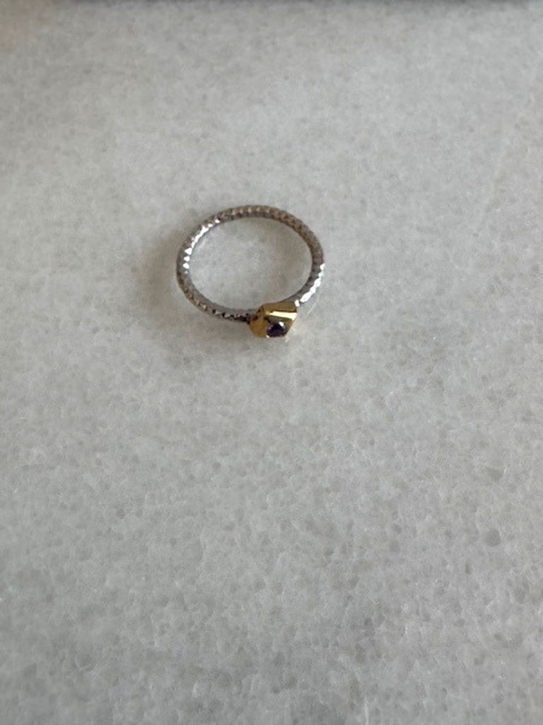 Handmade from 925 sterling silver with rhodium and gold plating, this elegant minimal ring features a high‑quality purple zircon stone. Every detail is crafted by hand, and its open‑back design ensures both comfort and style, making it a timeless accessory for everyday wear or special occasions.