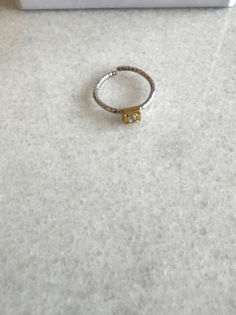 Handmade from 925 sterling silver with rhodium and gold plating, this minimal ring features a high‑quality zircon stone. Every detail is carefully crafted by hand, and its open‑back design ensures comfort and elegance, making it a timeless accessory for both everyday wear and special occasions.