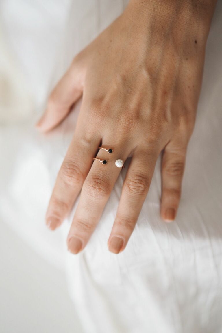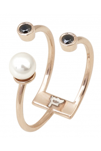 Crafted from 925 sterling silver with rose plating. Features black zircon stone and Majorca pearl. Handmade design.