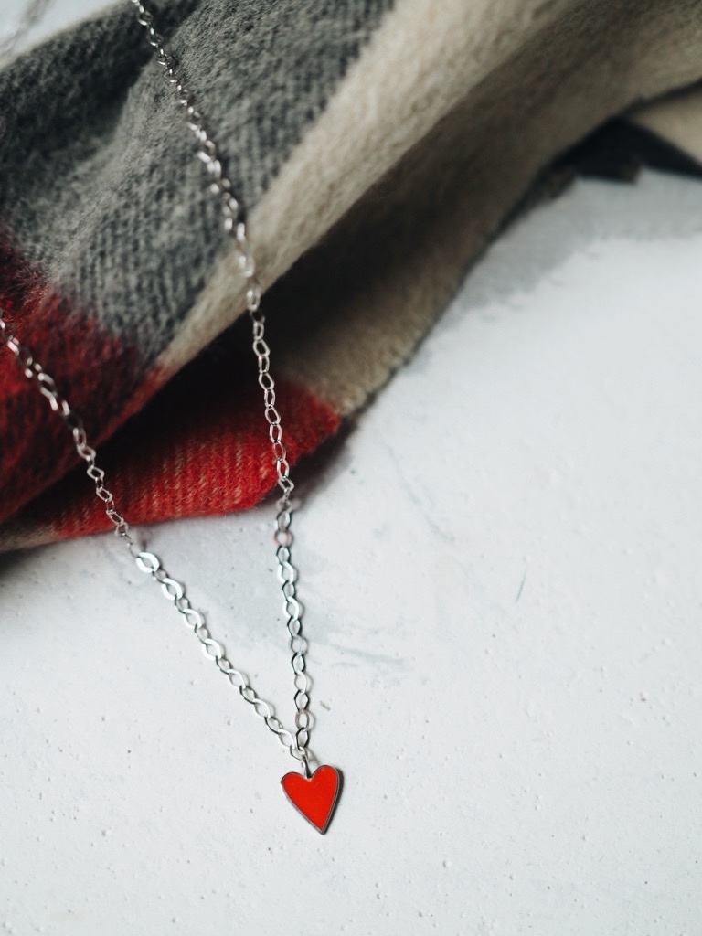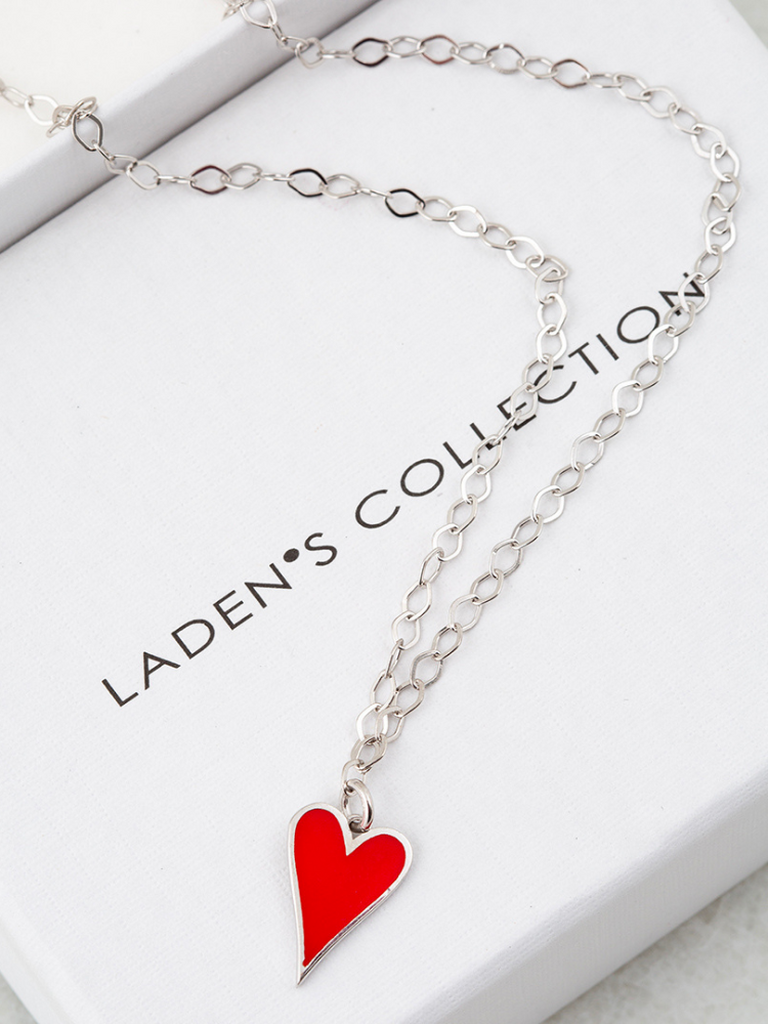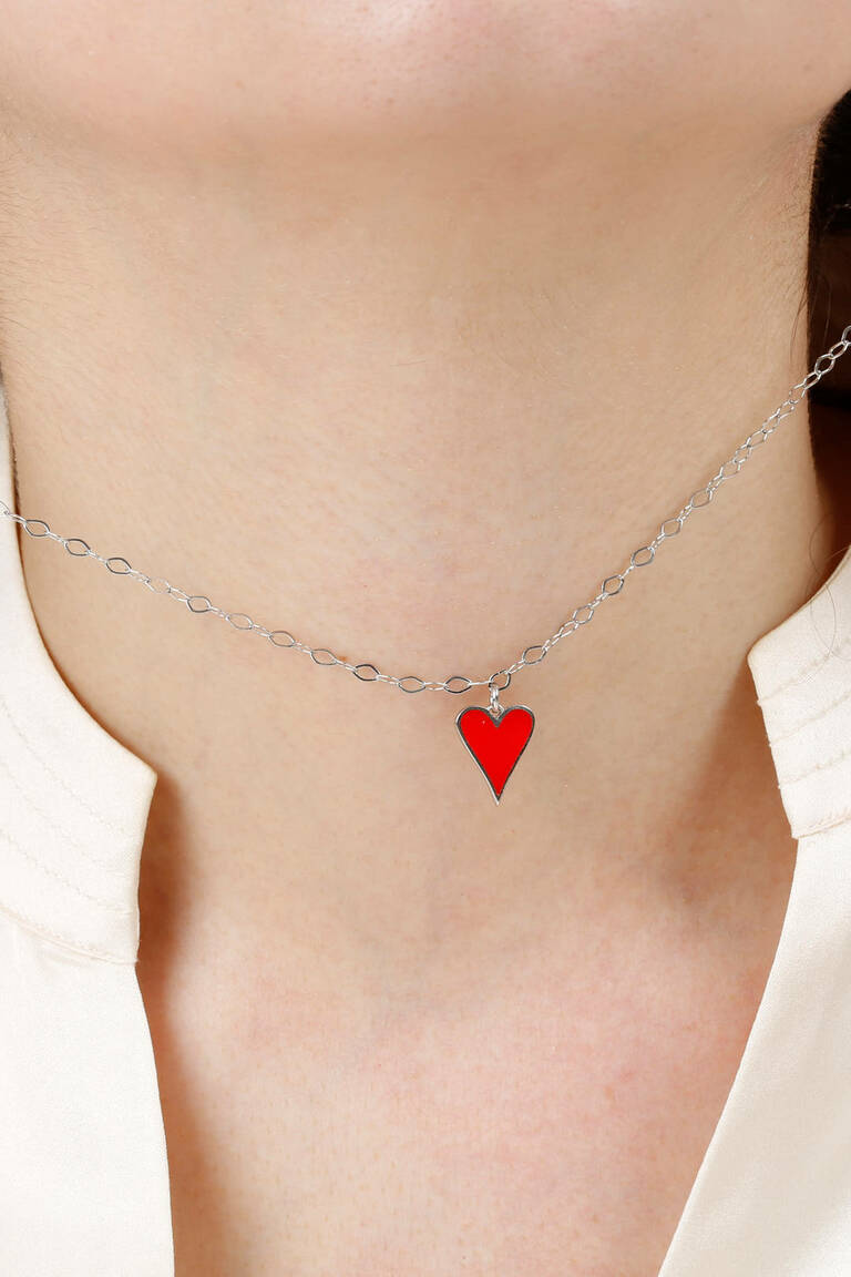 Handmade from 925 sterling silver with rhodium plating, adorned with red enamel. Chain length: 70 cm.