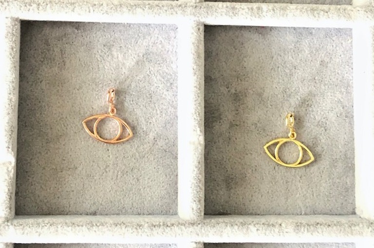 This eye charm is crafted from 925 sterling silver with elegant rose‑gold plating. Each piece is handmade, offering a unique artisanal touch suitable for bracelets, necklaces, or personalized jewelry designs.
