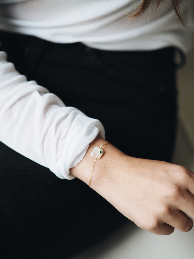 Crafted from 925 sterling silver with gold plating. Handmade design. Features a baroque pearl accented with a green stone.