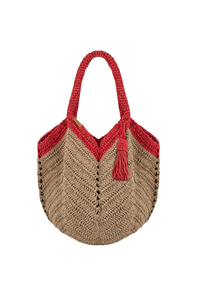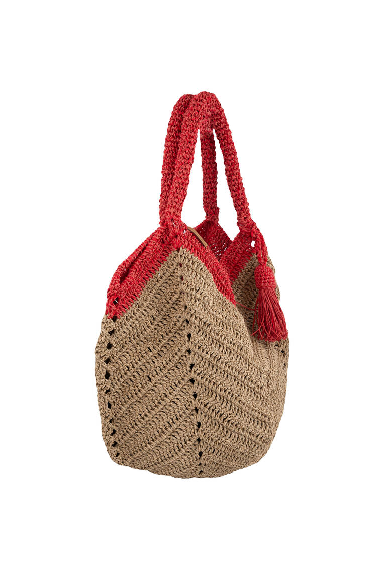 This hand‑knitted beach bag measures 40×48 cm, offering a spacious and lightweight design ideal for summer use.